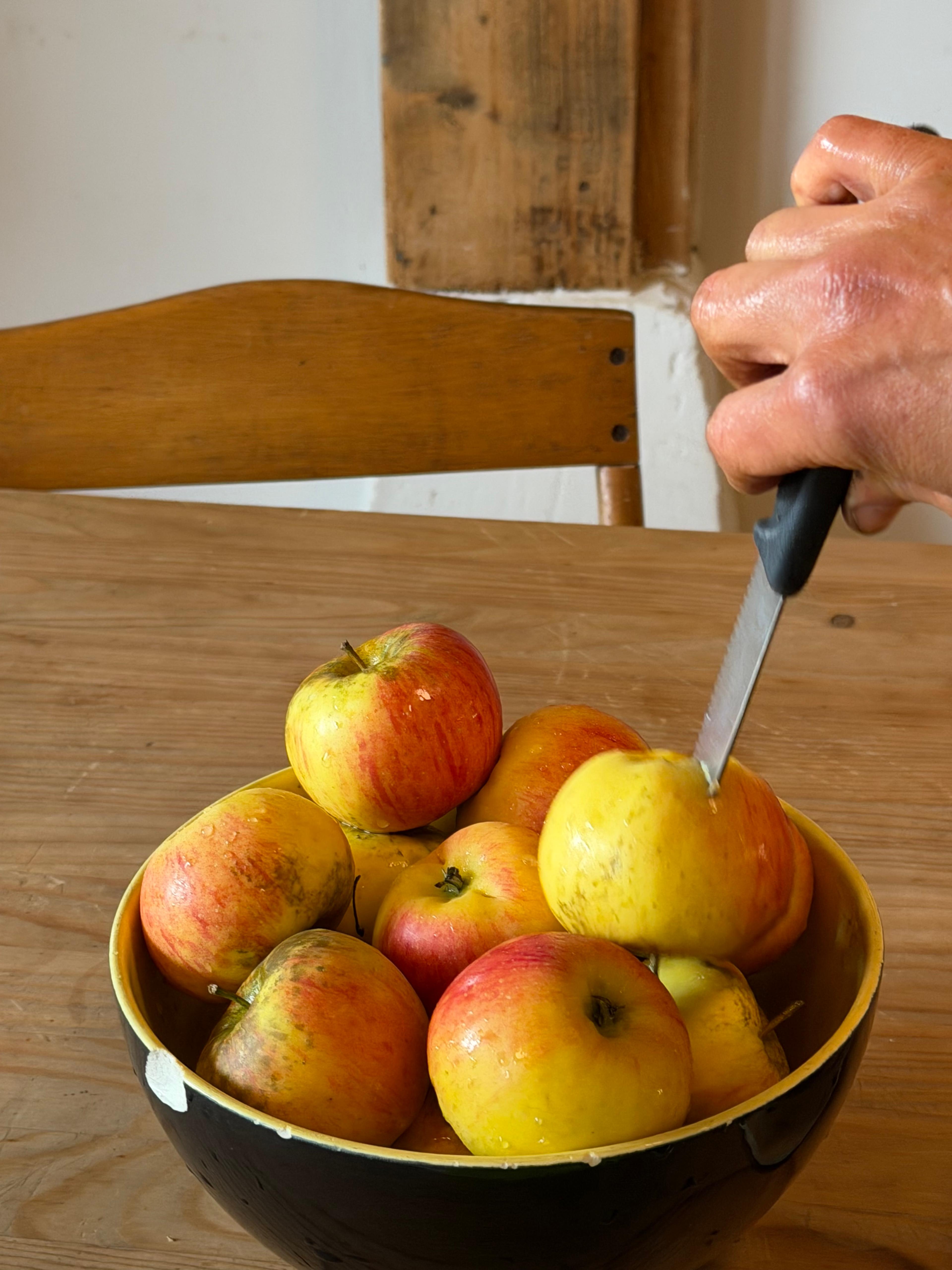Den Pausentisch hat Robi hergerichtet, der macht das immer ganz besonders schön, und die Tese stellt beglückt fest, dass auch hier noch alles wunderbar so ist wie damals vor einem Jahr: Das Messer, das im Apfel steckt, und das beste Konfibrot der Welt gibt es - und herrlichen warmen Hoftee - danke Rosa aus Gmunden und Teegruppe.