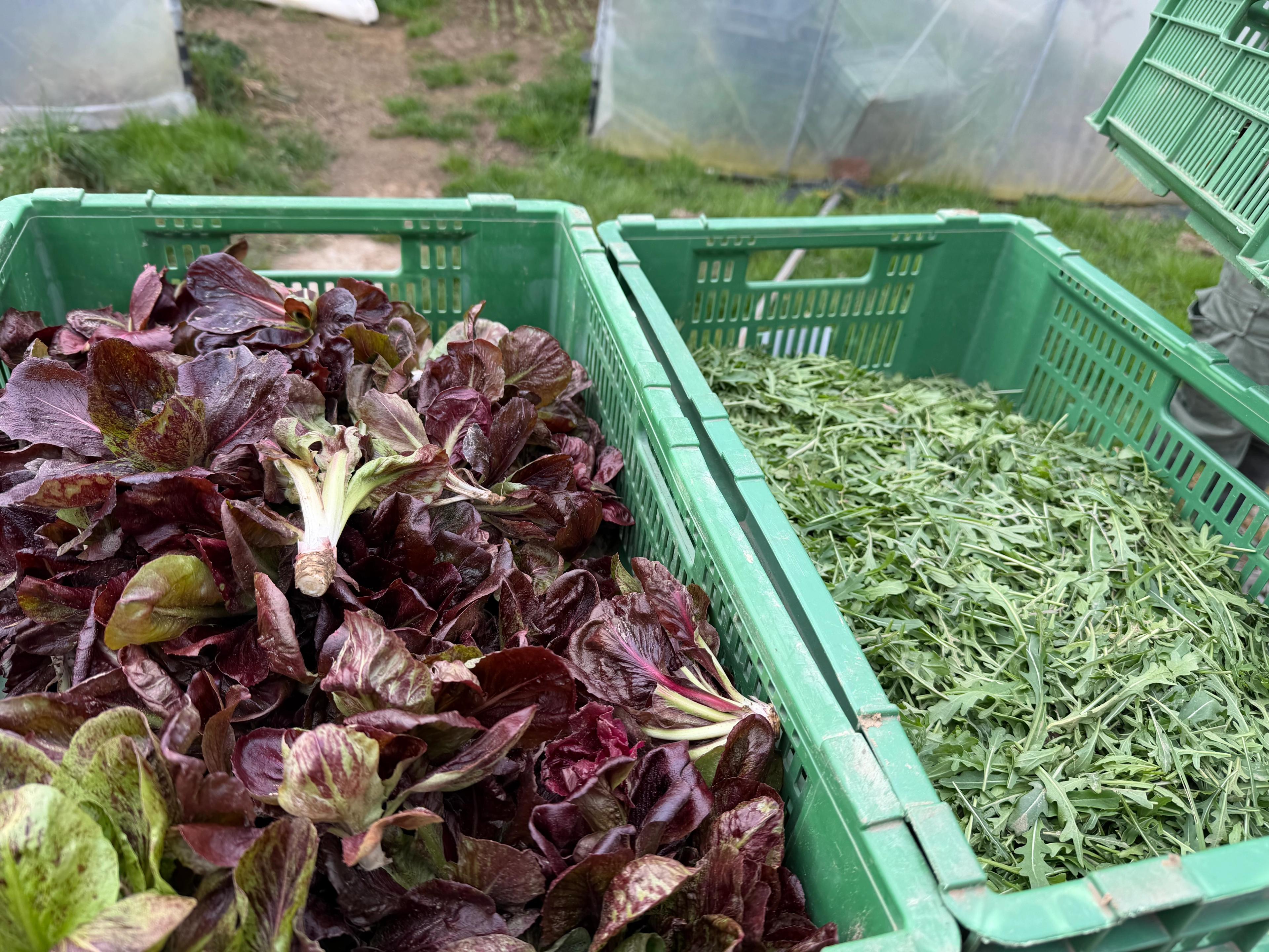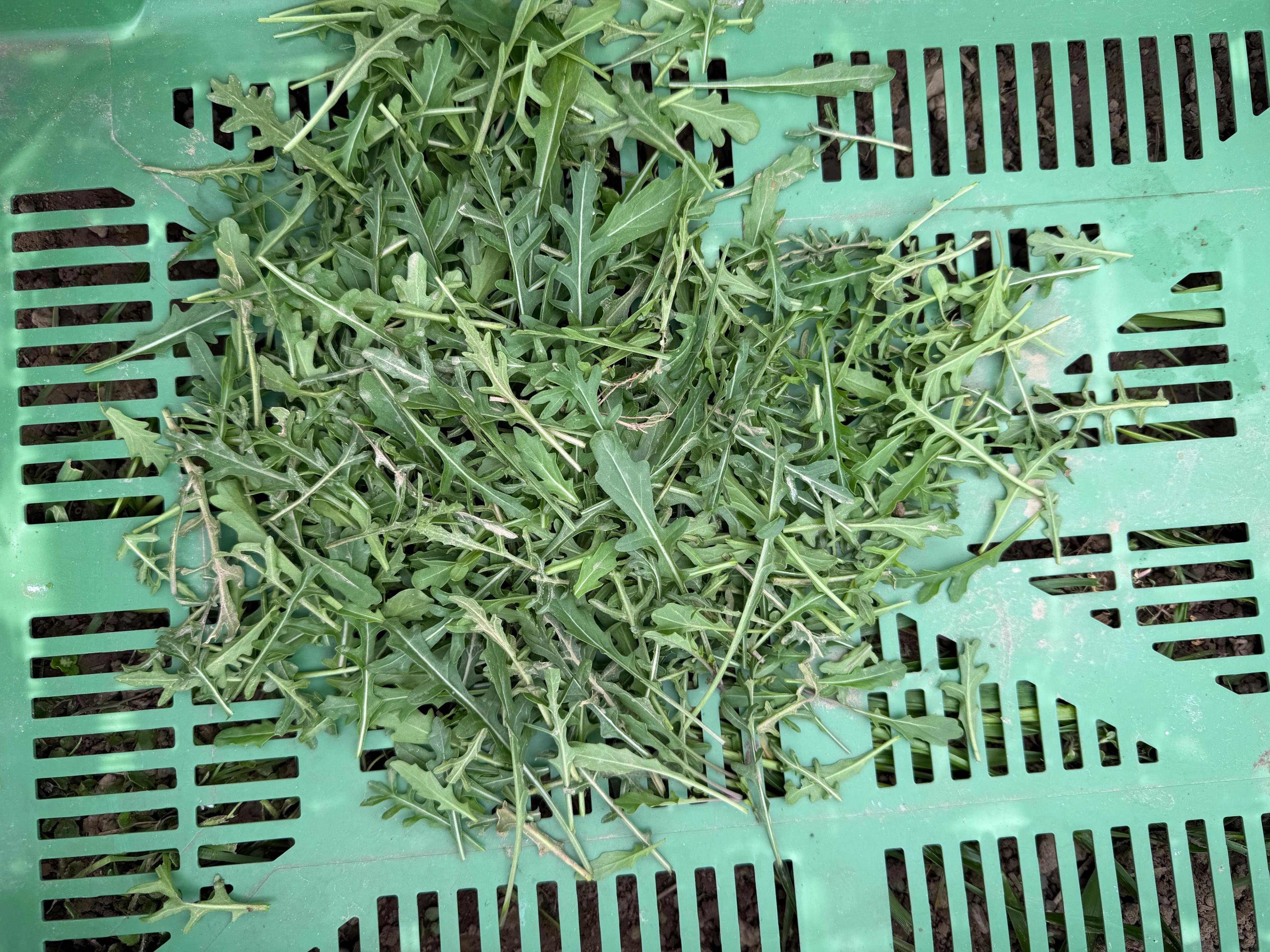 Im Tunnel ernten wir herrlichen Spinat, gefolgt von Schnittsalat, das wickelt sich locker und flott ab. Es folgt dann die Ruccola-Tour, die geht auch leicht, man muss sie einfach mental verkraften. Der Ruccolo präsentiert sich erntebereit stets in putzigen Spiralen, gibt da ordentlich was her, und geschnitten, den Boden einer Gemüsekiste bedeckend, wirkt er dann so ein wenig wie ein eingeschüchtertes Häufchen. Aber abgepackt für die Abo-Taschen, in attraktiven Portionen, wird er sich dann ganz sicher wieder äusserst verlockend ausnehmen.