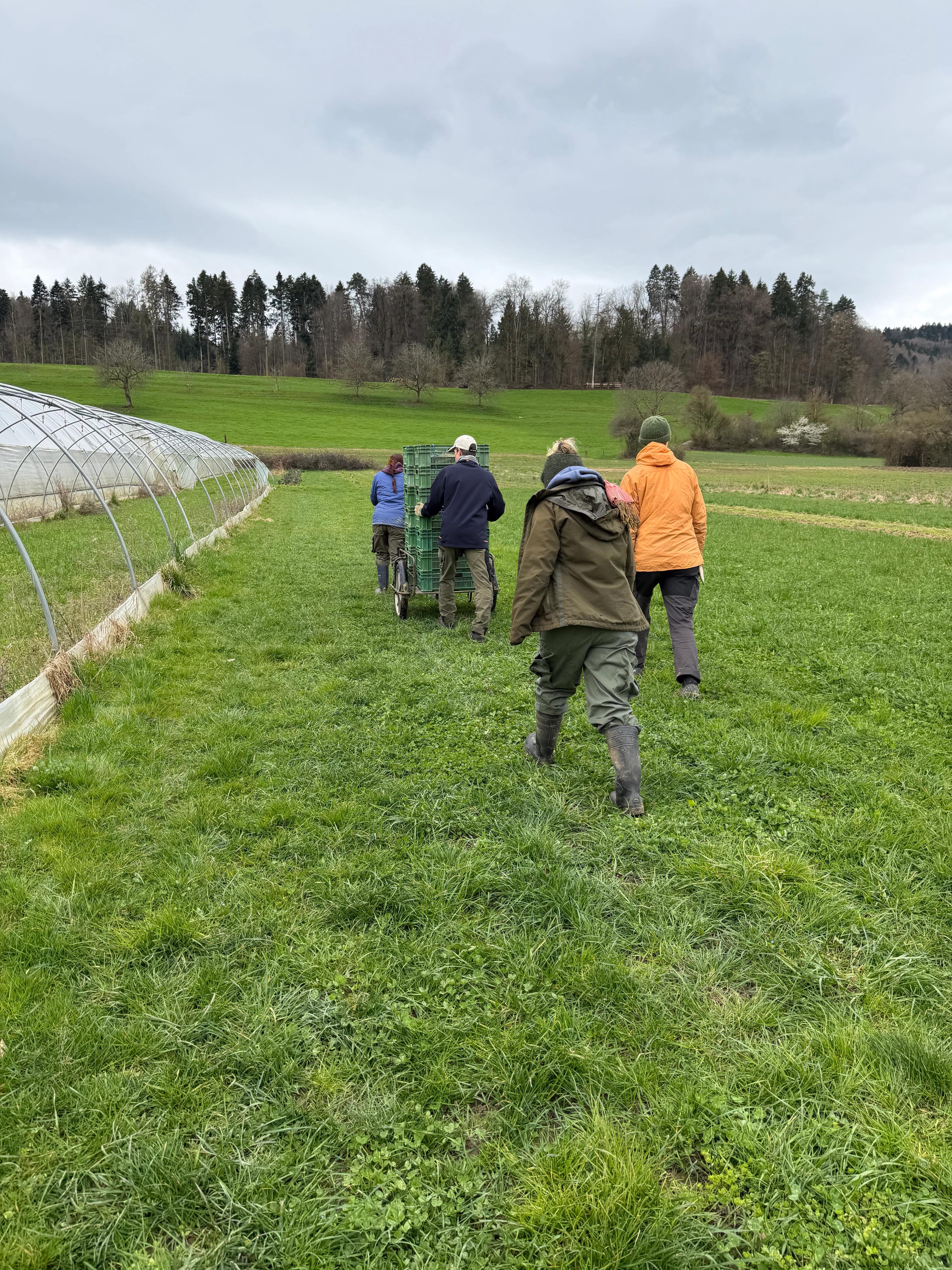 Schwungvoll zielgerichtet geht es jetzt mit Wagen und Erntekisten zu dem zweiten Gemüsetunnel hoch, wo die Ernte beginnen wird.